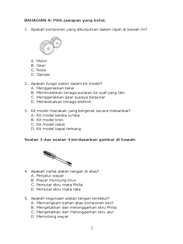 Tiap-tiap soalan diikuti oleh empat pilihan jawapan iaitu A B C dan D. C Menyambung dan menggerakkan roda D Menukarkan kelajuan atau arah. Gear dipacu dan gear pemacu.